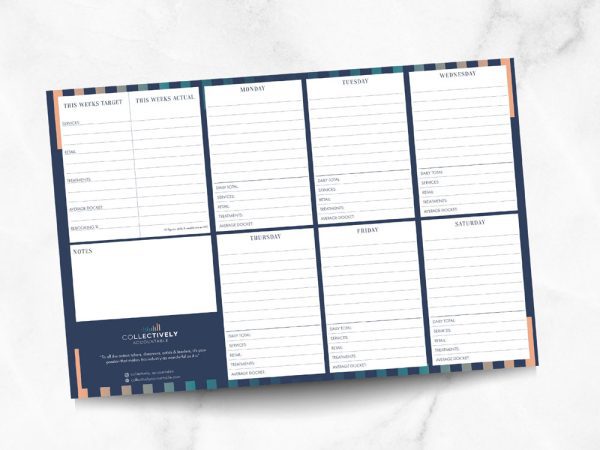 A3 tear-off 50 sheet wall or desk planner with target tracker, for salon owners to use themselves or display in the salon to get your whole team on board in helping the salon hit targets.